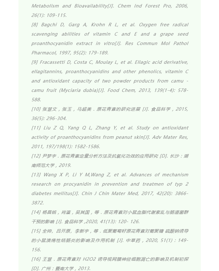 ? 抗氧化活性 :原花青素是國際公認(rèn)的抗氧化性極強(qiáng)的天然抗氧化劑,抗氧化活性是維生素 E 的 50 倍,是維生素C的20倍,尤其是體內(nèi)抗氧化活性,是其他抗氧化劑難以媲美的 [8]。原花青素的作用機(jī)制是其在體內(nèi)釋放 H+,競爭性地與自由基結(jié)合并反應(yīng),一方面? 可保護(hù)脂質(zhì)不被氧化,阻斷自由基鏈?zhǔn)椒磻?yīng);另一方面? 經(jīng)反應(yīng)后產(chǎn)生的半醌自由基再通過親核加成反應(yīng)生成具有兒茶酸及焦酚結(jié)構(gòu)的聚合物,仍然具有很強(qiáng)的抗氧化活性 [9-10]。原花青素的抗氧化活性與濃度、聚合度、羥基位置、連接方式、空間構(gòu)型、溶劑等等均有關(guān)系。其活性呈劑量 - 效應(yīng)關(guān)系,當(dāng)超出一定濃度范圍,其濃度升高,活性反而降低 [8]。