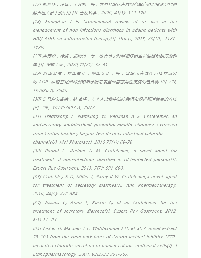 ? 其他生物活性研究: 除了抗氧化外,國內(nèi)外學(xué)者對原花青素的活性展開了大量研究,主要包括降血脂、抗炎、抗動脈粥樣硬化、抗癌、調(diào)節(jié)血糖、神經(jīng)系統(tǒng)性疾病、抗腹瀉等方面 [13-17]。其中,原花青素在抗腹瀉上應(yīng)用成果最為突出。2012 年,美國食品和藥品監(jiān)督管理局(FDA)批準(zhǔn)Fulyzaq(商品名為 Crofelemer)用于治療 AIDS 患者的腹瀉癥狀;Crofelemer 提取自大戟科龍血巴豆的紅色乳膠,是一種平均分子量約為2200 ku的多種原花青素單體的隨機(jī)聚合的產(chǎn)物 [18]